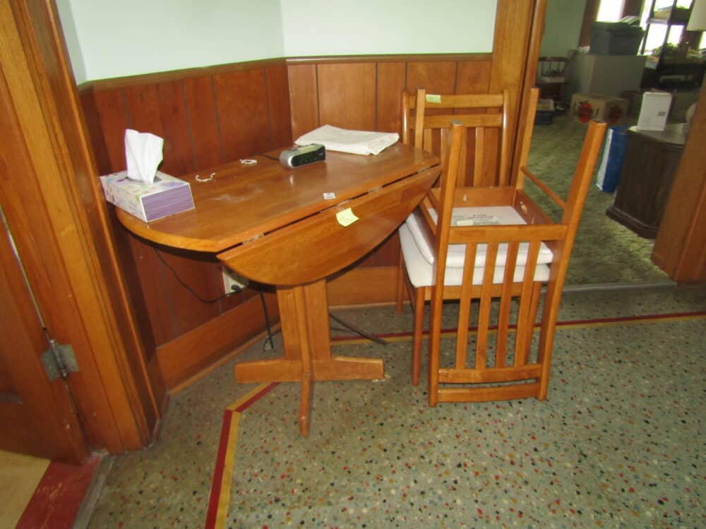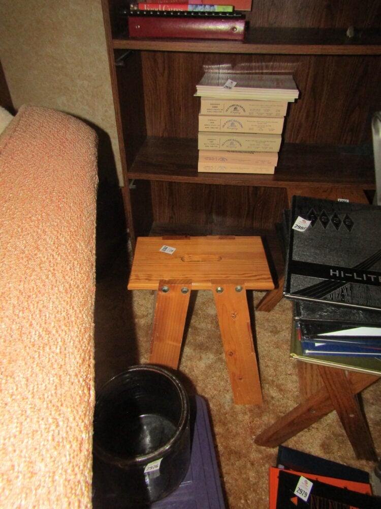 Children’s folding table w/ 2 chairs’ Vintage Midcentury modern shoe store fitting stool; Mid century modern sofa; Mid century modern chair; End tables; Side tables; Lamp stands; Midcentury modern rocker; Singer sewing machine in cabinet; Singer treadle sewing machine in cabinet; Antique Oak buffet/sideboard; Children’s school desks w/ chairs; Children’s chairs; Vintage radios; Book shelf; Drop leaf table w/ 2 chairs; Early drop leaf table on wheels; Early Sunbeam & G.E. irons; Sm. kitchen appliances; Pyrex & Anchor Hocking bowls, & bakeware; Vintage Fire King coffee mugs; Fire King peach lusterware; Pots & pans; Bakeware; Pyrex au gratin dishes; Silverware; Corelle ware; Cleaning supplies; Advertising key chains, note pads, etc.; Maytag portable dishwasher; Dolls; Games; Puzzles; Kids toys; Barbie dolls; Crocks; Vintage sewing supplies; Linens; Blankets; Afghans; Decanters; and much more.